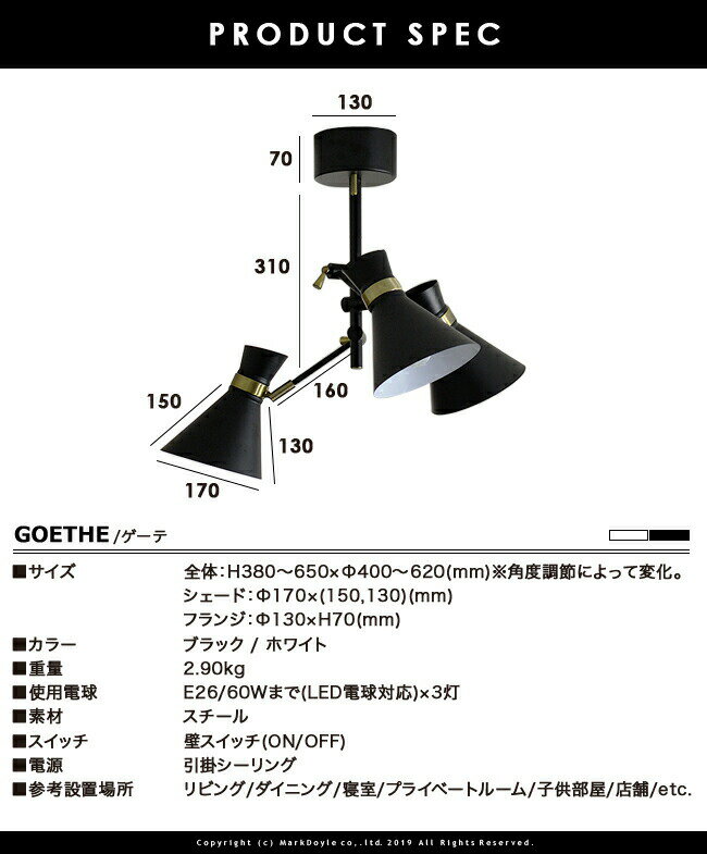 シーリングライト 3灯 ブルックリン インダストリアル リビング用 居間用 ダイニング用 食卓用 寝室 子供部屋 6畳 8畳 おしゃれ 照明 アーム スチールシェード ブラック ホワイト スポットライト 間接照明 天井照明 デザイナーズ モダン ゴールド [GOETHE:ゲーテ](2-2